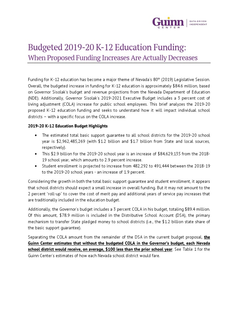on Governor Sisolak’s budget and revenue projections from the Nevada Department of Education