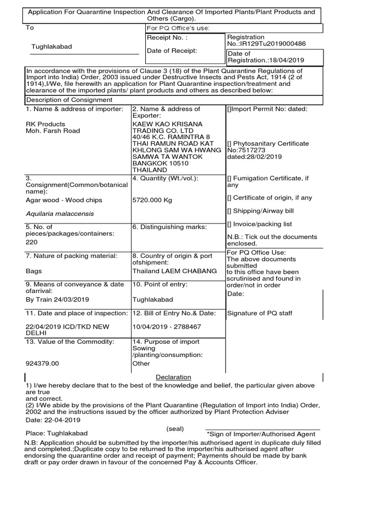 Application For Quarantine Inspection And Clearance Of Imported Plants/Plant Products and