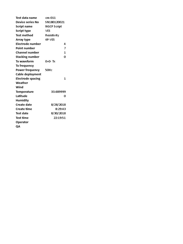 Electrode ID Test date Test time P1 Rg(ohm) Status