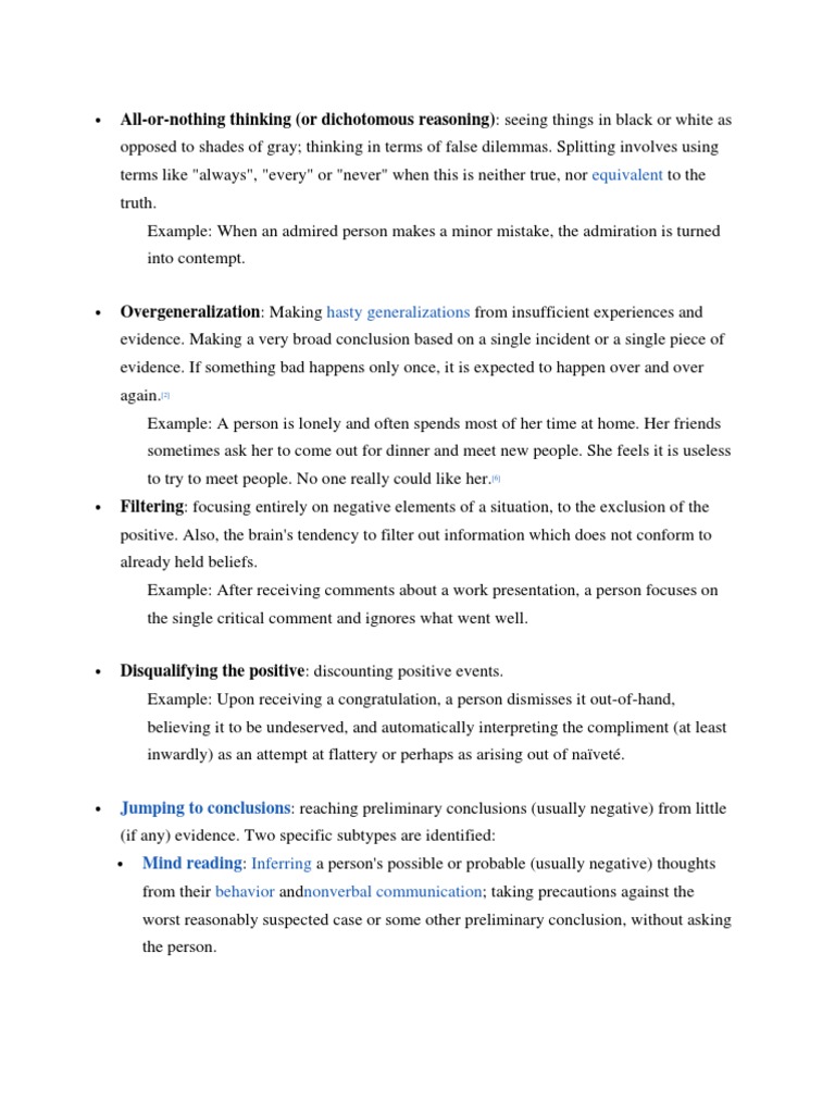 All-or-nothing thinking (or dichotomous reasoning): seeing things in black or white as