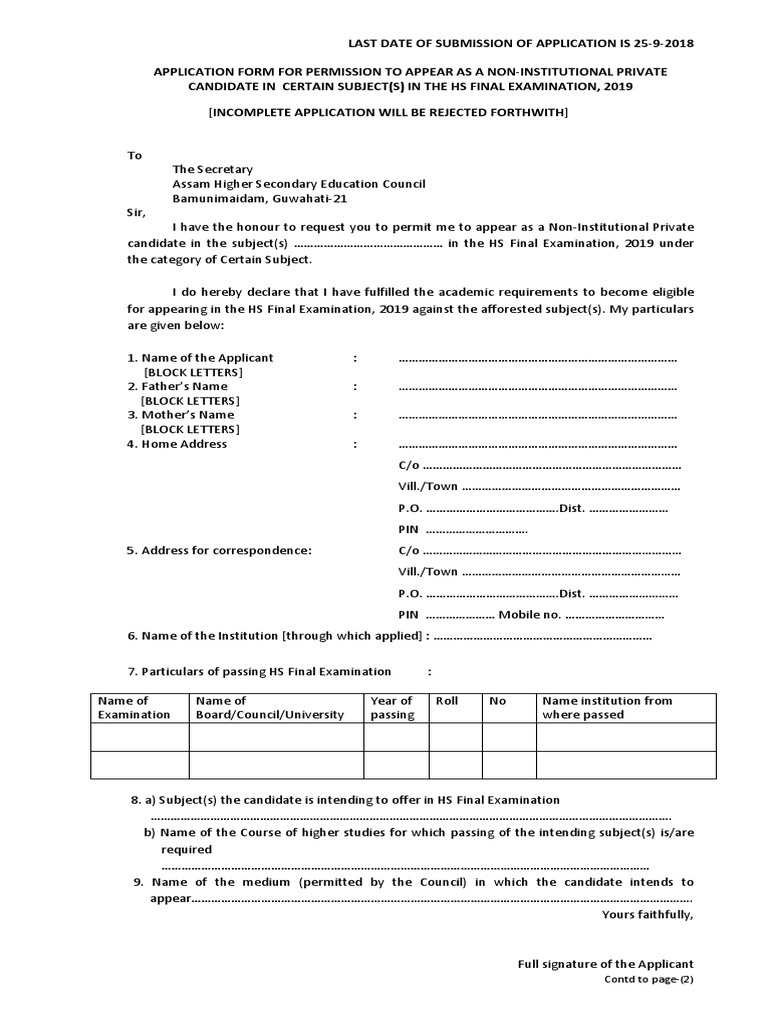 for appearing in the HS Final Examination, 2019 against the afforested subject(s). My particulars