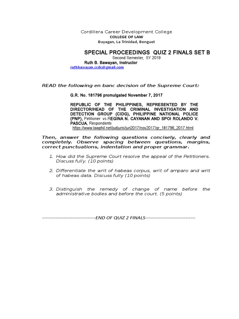 SPECIAL PROCEEDINGS QUIZ 2 FINALS SET B