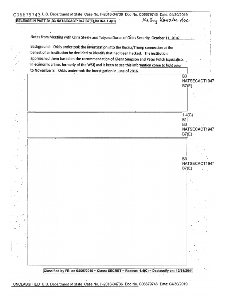 Deputy Assistant Secretary Kavalec typed notes from Oct. 11, 2016 about meeting with Christopher Steele.
