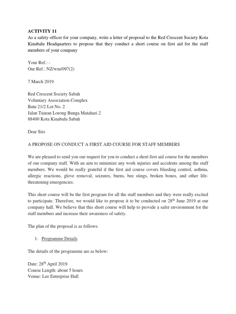 As a safety officer for your company, write a letter of proposal to the Red Crescent Society Kota