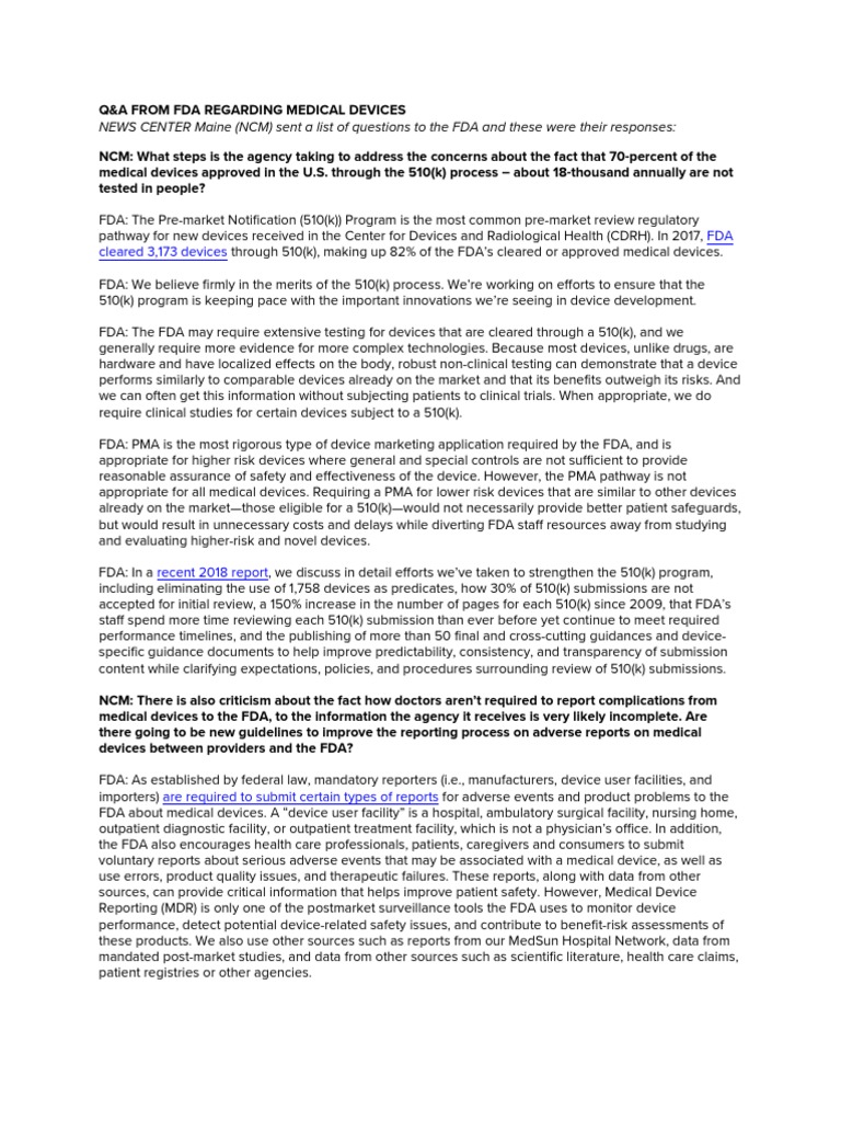 NEWS CENTER Maine (NCM) sent a list of questions to the FDA and these were their responses: