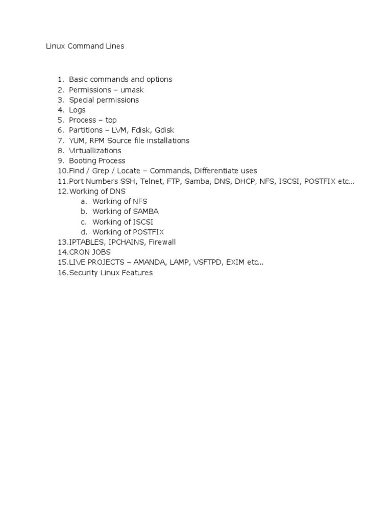 single-user-mode, and other important, basic commands viz., cat, du, df, tar, rpm, wc, history, etc.