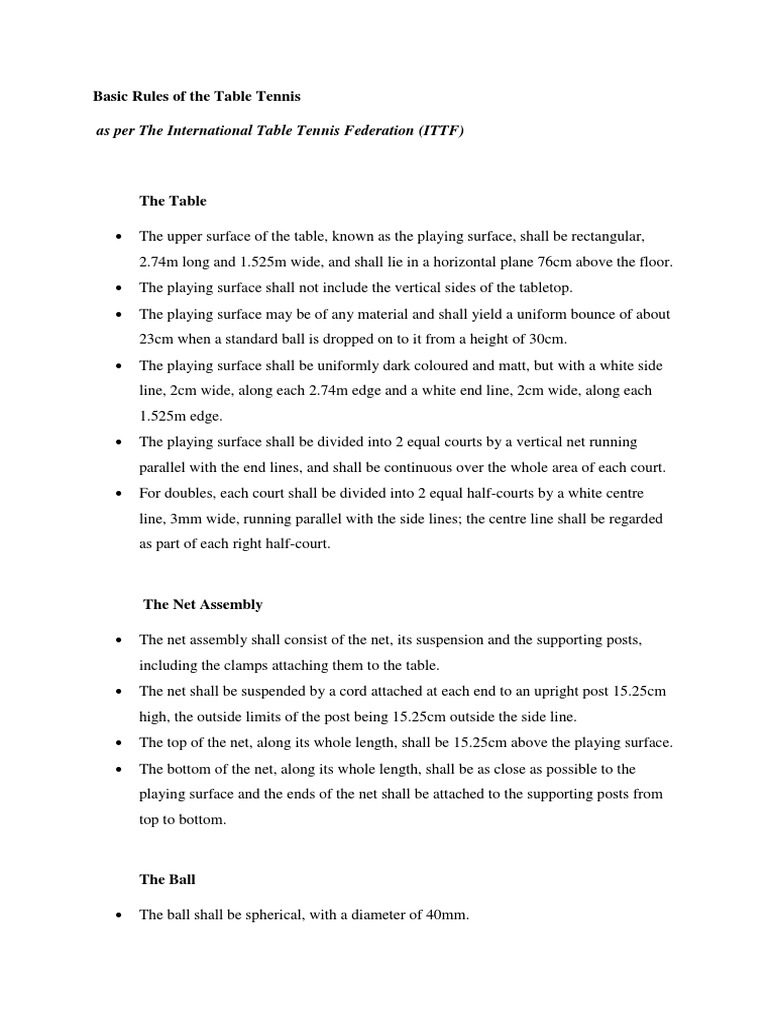 2.74m long and 1.525m wide, and shall lie in a horizontal plane 76cm above the floor.