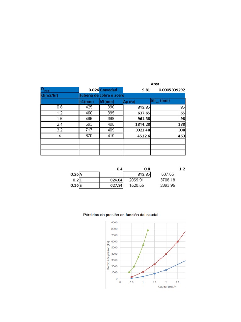 Re Velocidad h1(mm) h8(mm) ∆p (Pa) ∆h1-8 (mm)