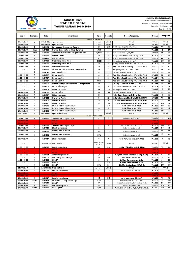 08.00-10.00 4 ME4411 Marine Diesel A 40 Ir. Aguk Zuhdi [Link]., [Link]., Ph.D. WA 104 AZ EJ