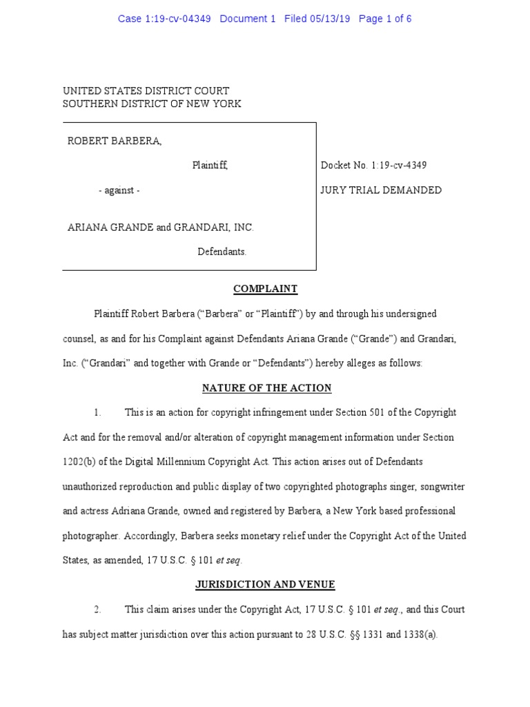 Robert Barbera, a photographer, filed a copyright infringement lawsuit against Ariana Grande and her company Grandari, Inc. The complaint alleges that Barbera photographed Grande and owns the copyrights to those photos. It further alleges that Grande and Grandari reproduced and displayed those photos without authorization on Grande's Instagram account, infringing on Barbera's copyrights. The complaint brings two claims: copyright infringement under federal law and removal of copyright management information, also under federal law. It seeks damages and profits from the defendants as well as injunctive relief.