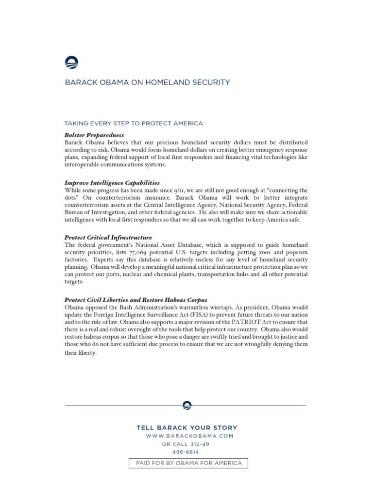 Obama opposed the Bush Administration’s warrantless wiretaps. As president, Obama would update the Foreign Intelligence Surveillance Act (FISA) to prevent future threats to our nation and to the rule of law. Obama also supports a major revision of the PATRIOT Act to ensure that there is a real and robust oversight of the tools that help protect our country. Obama also would restore habeas corpus so that those who pose a danger are swiftly tried and brought to justice and those who do not have sufficient due process to ensure that we are not wrongfully denying them their liberty.