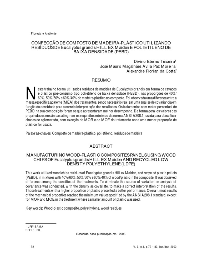 This work utilized wood chips residues of Eucalyptus grandis Hill ex Maiden, and recycled plastic pellets