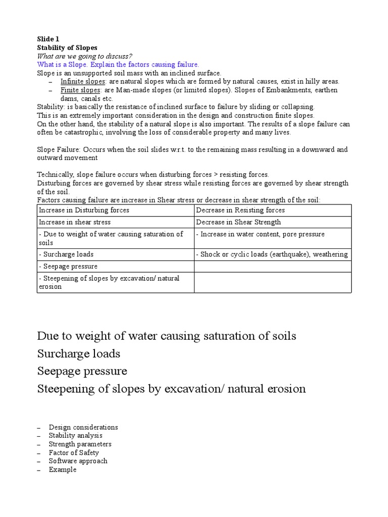 Technically, slope failure occurs when disturbing forces > resisting forces.