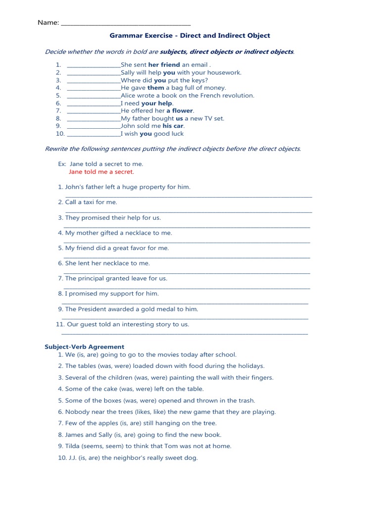 Decide whether the words in bold are subjects, direct objects or indirect objects.