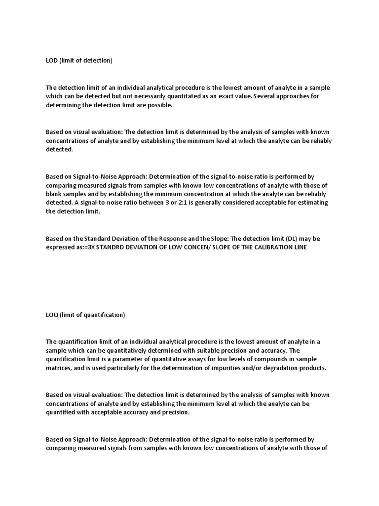 Based on the Standard Deviation of the Response and the Slope: The quantitation limit (QL) may be