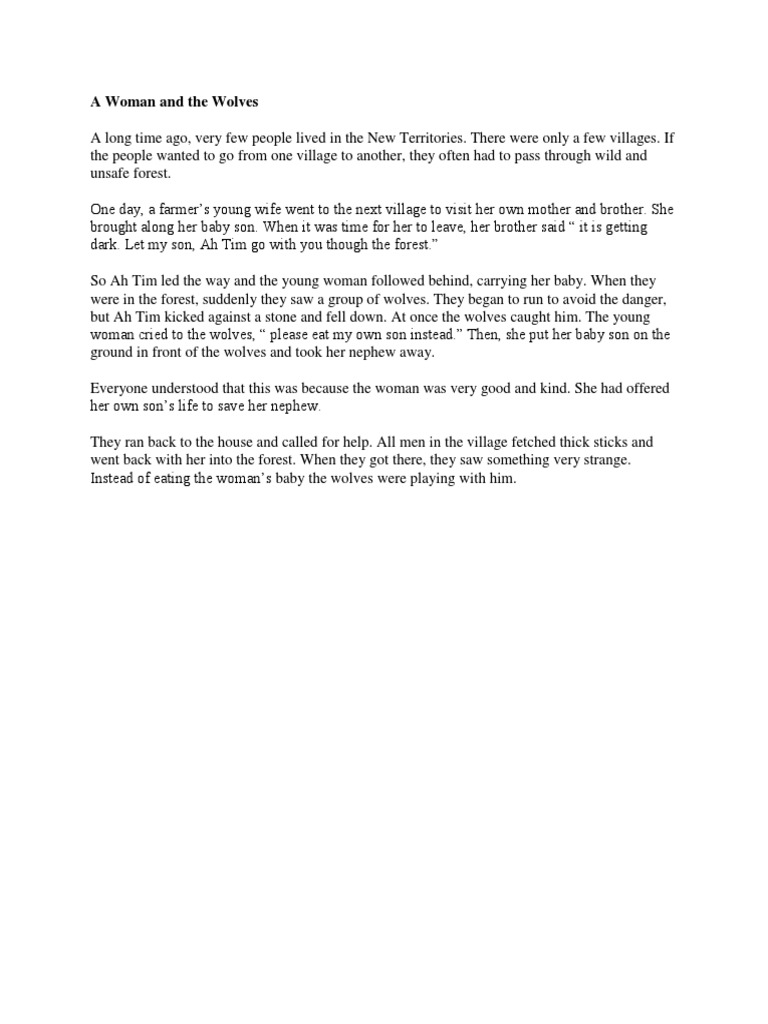 woman cried to the wolves, “ please eat my own son instead.” Then, she put her baby son on the