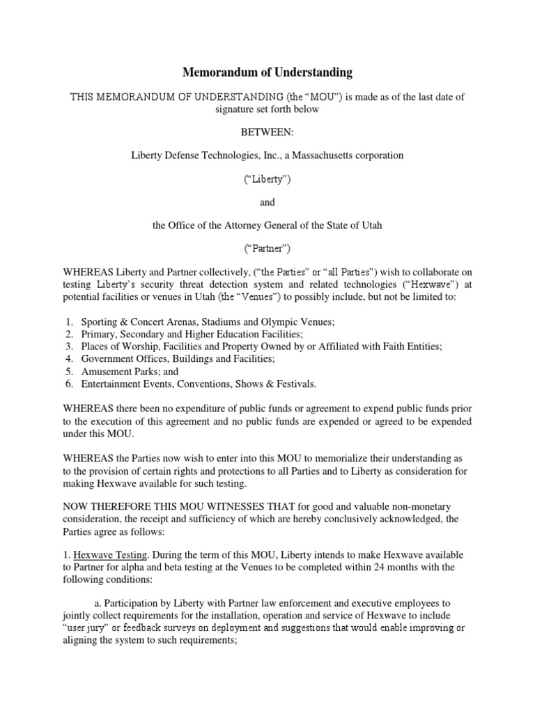 Entertainment Events, Conventions, Shows & Festivals. WHEREAS there been no expenditure of public funds or agreement to expend public funds prior to the execution of this agreement and no public funds are expended or agreed to be expended under this MOU. WHEREAS the Parties now wish to enter into this MOU to memorialize their understanding as to the provision of certain rights and protections to all Parties and to Liberty as consideration for making Hexwave available for such testing. NOW THEREFORE THIS MOU WITNESSES THAT for good and valuable non-monetary consideration, the receipt and sufficiency of which are hereby conclusively acknowledged, the Parties agree as follows: 1. Hexwave Testing. During the term of this MOU, Liberty intends to make Hexwave available to Partner for alpha and beta testing at the Venues to be completed within 24 months with the following conditions: a. Participation by Liberty with Partner law enforcement and executive employees to jointly collect requirements for the installation, operation and service of Hexwave to include