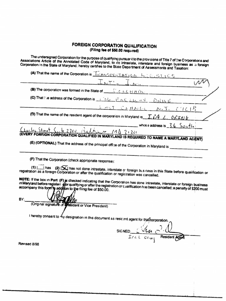 Transportation Logistics International Inc. business filing in Colorado Feb. 16th, 2001 three pages