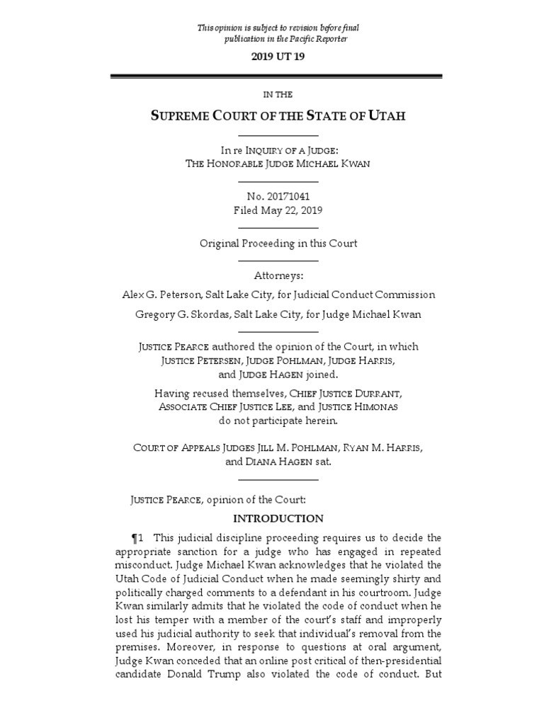 No. 20171041 Filed May 22, 2019 Original Proceeding in this Court Attorneys: Alex G. Peterson, Salt Lake City, for Judicial Conduct Commission Gregory G. Skordas, Salt Lake City, for Judge Michael Kwan J