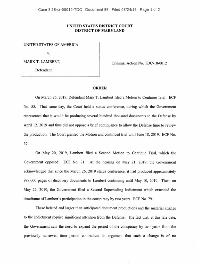 Judge Theodore Chuang's two-page court order dated May 24th 2019 in Mark T. Lambert's Uranium One trial