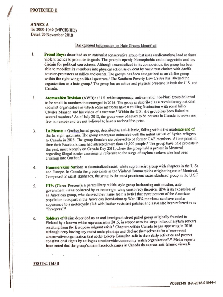 Page from the Canadian military police intelligence report, "White Supremacy, Hate Groups, and Racism in the Canadian Armed Forces," Nov. 29, 2018.