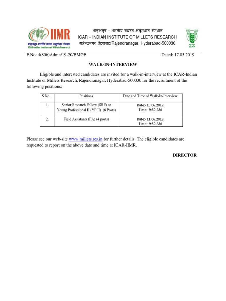 Institute of Millets Research, Rajendranagar, Hyderabad-500030 for the recruitment of the