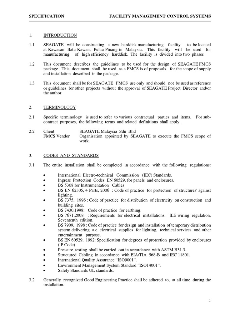 1.2 This document describes the guidelines to be used for the design of SEAGATE FMCS