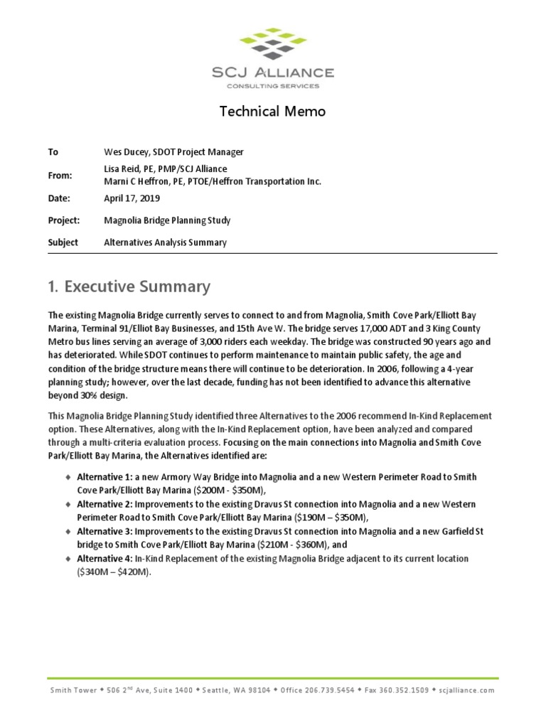 1. Executive Summary ............................................................................................................................................1 2. Table of Contents ...............................................................................................................................................3 3. Memo Purpose ...................................................................................................................................................5 3.1. Introduction ................................................................................................................................................5 3.1.1. Project Background ............................................................................................................................5 3.1.2. Project Purpose & Goals .....................................................................................................................5 3.1.3. Evaluation Process ..............................................................................................................................6 4. Description of Alternatives .................................................................................................................................7 4.1. Alternative 1 - Armory Way Bridge ............................................................................................................8 4.2. Alternative 2 - Dravus Street Upgrade .......................................................................................................9 4.3. Alternative 3 - Lower Magnolia Bridge .................................................................................................... 10 4.4. Alternative 4