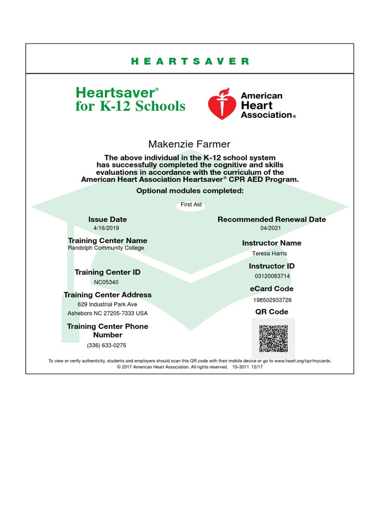 To view or verify authenticity, students and employers should scan this QR code with their mobile device or go to www.heart.org/cpr/mycards.