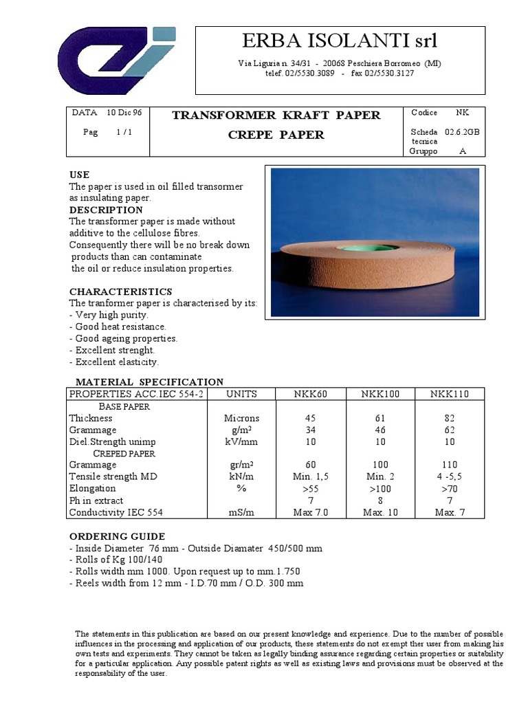 DATA 10 Dic 96 TRANSFORMER KRAFT PAPER Codice NK