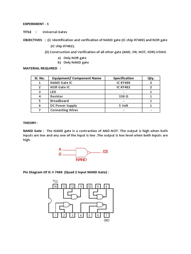 OBJECTIVES : (i) Identification and verification of NAND gate (IC chip #7400) and NOR gate