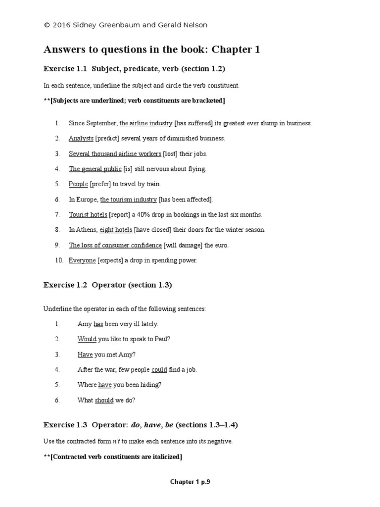 Exercise 1.1 Subject, predicate, verb (section 1.2)