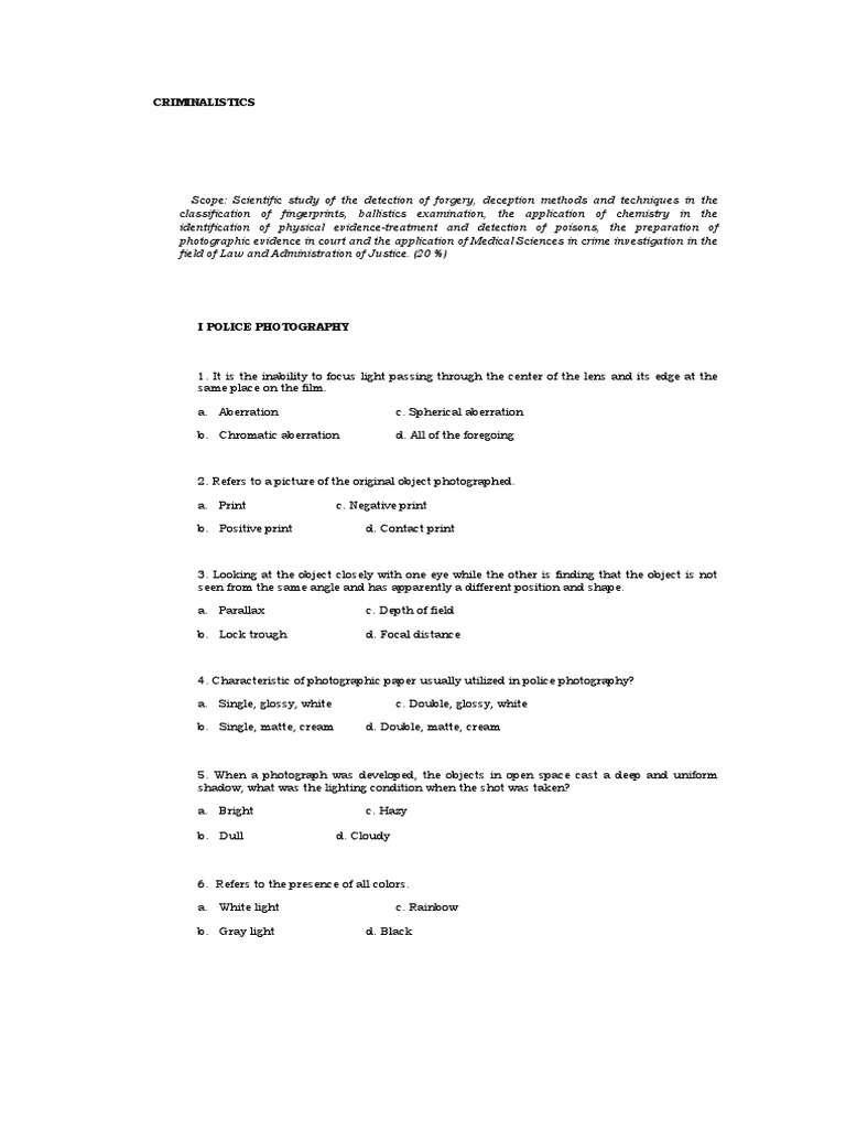 classification of fingerprints, ballistics examination, the application of chemistry in the