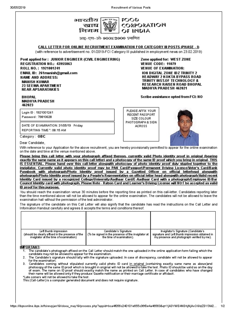 1. The candidate's photograph affixed on the Call Letter should match the one uploaded in the online application form failing which the