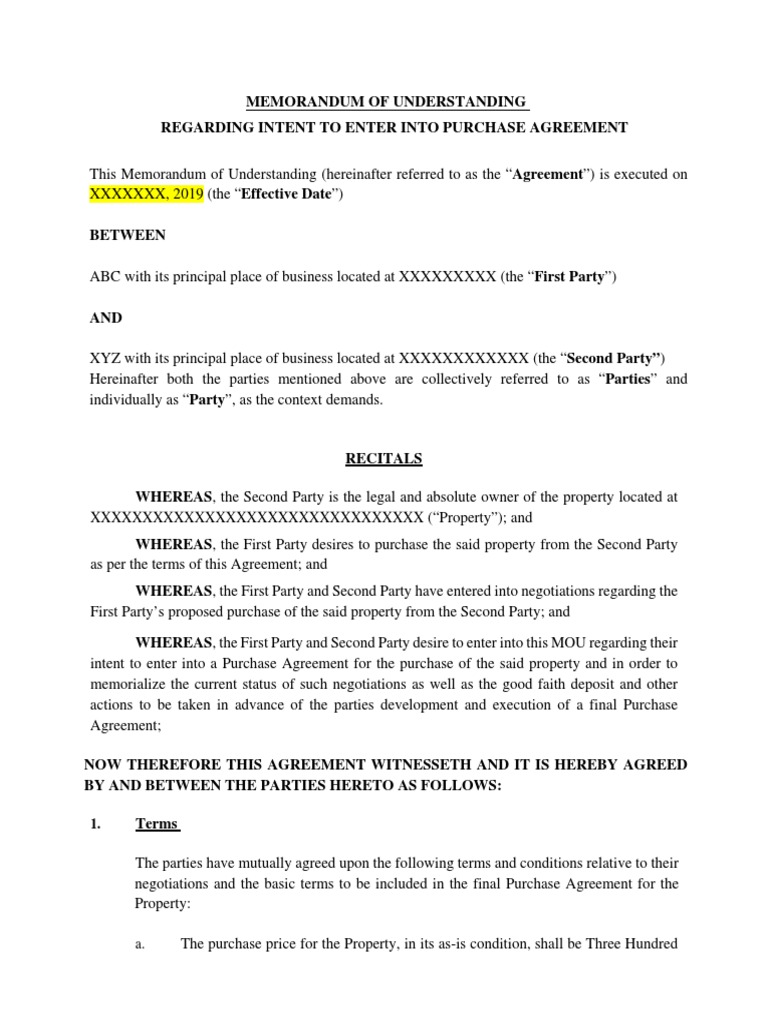 First Party’s proposed purchase of the said property from the Second Party; and