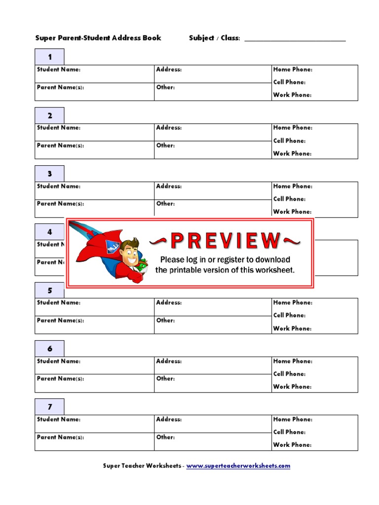 Super Parent-Student Address Book Subject / Class: ___________________________