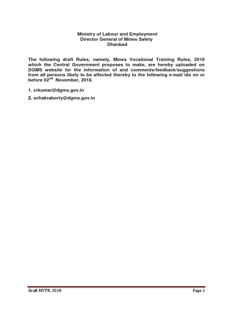 The following draft Rules, namely, Mines Vocational Training Rules, 2018