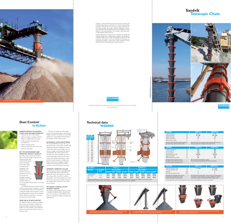 telescopic chute. The automatic level sensor means that the Sandvik WE8000i telescopic chute senses its height As the material stockpile grows, the WE8000i retracts as the segments are drawn into one another. The carrying collar can be separated easily, and the chute segment replaced or turned. The modular