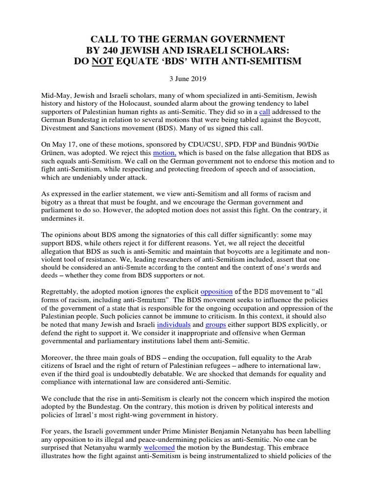 Call by 240 Jewish and Israeli Scholars To German Government On BDS and Anti-Semitism
