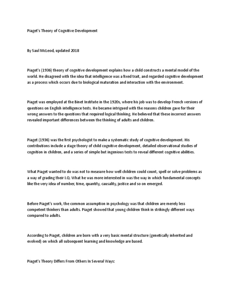 Piaget's Theory Differs From Others In Several Ways: