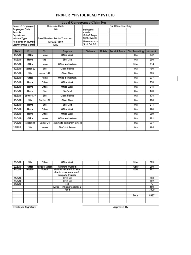 Date From To Purpose Distance Mobile Food & Travel Ola/ Travelling Amount