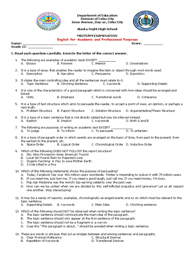 I. Read each question carefully. Encircle the letter of the correct answer.