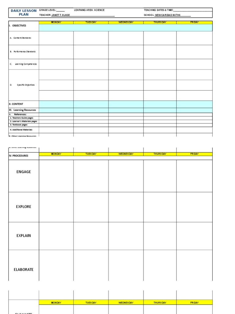 DAILY LESSON GRADE LEVEL: LEARNING AREA: _____________________________________TEACHING DATES & TIME:______________________________
