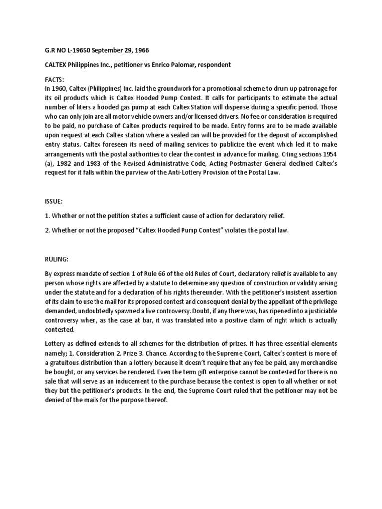namely; 1. Consideration 2. Prize 3. Chance. According to the Supreme Court, Caltex’s contest is more of