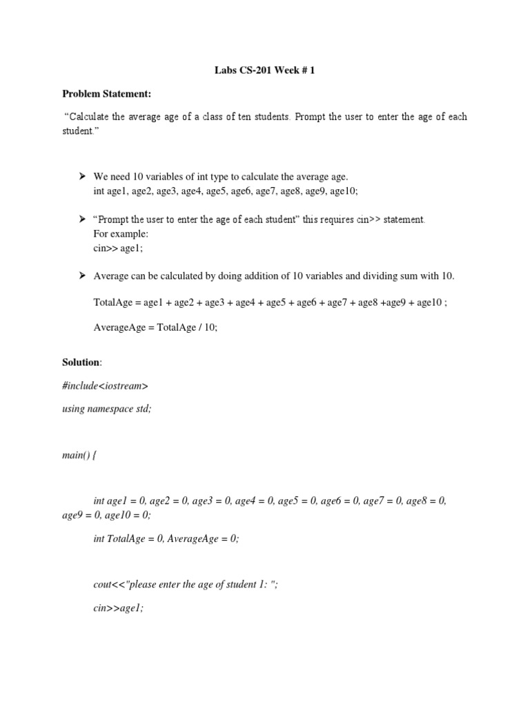 “Calculate the average age of a class of ten students. Prompt the user to enter the age of each