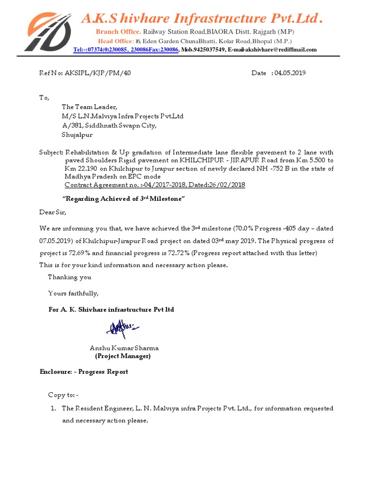 07.05.2019) of Khilchipur-Jirapur Road project on dated 03rd may 2019. The Physical progress of
