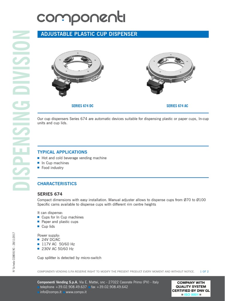 Our cup dispensers Series 674 are automatic devices suitable for dispensing plastic or paper cups, In-cup