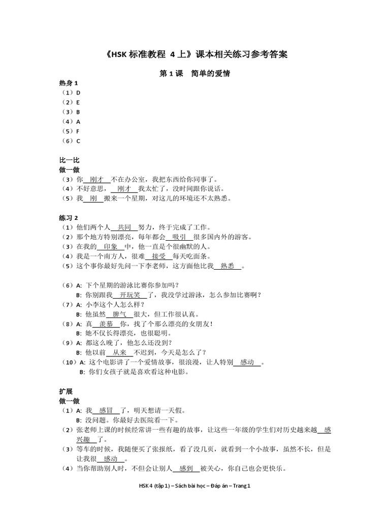 HSK 4 (tập 1) – Sách bài học – Đáp án – Trang 1