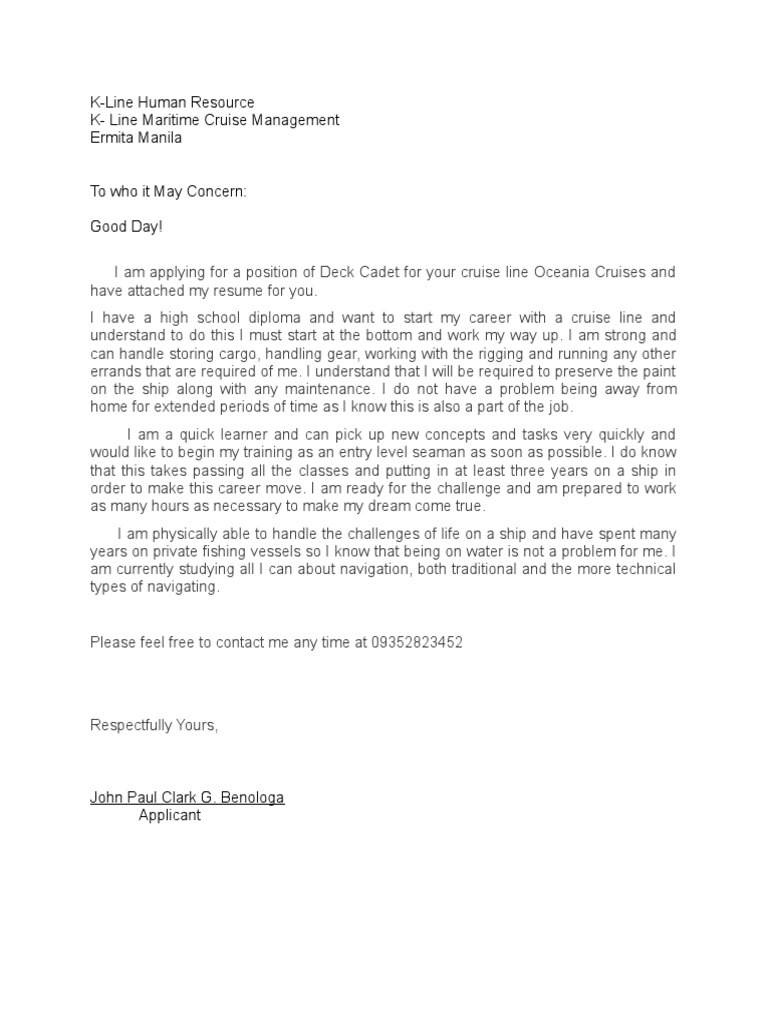 I am applying for a position of Deck Cadet for your cruise line Oceania Cruises and