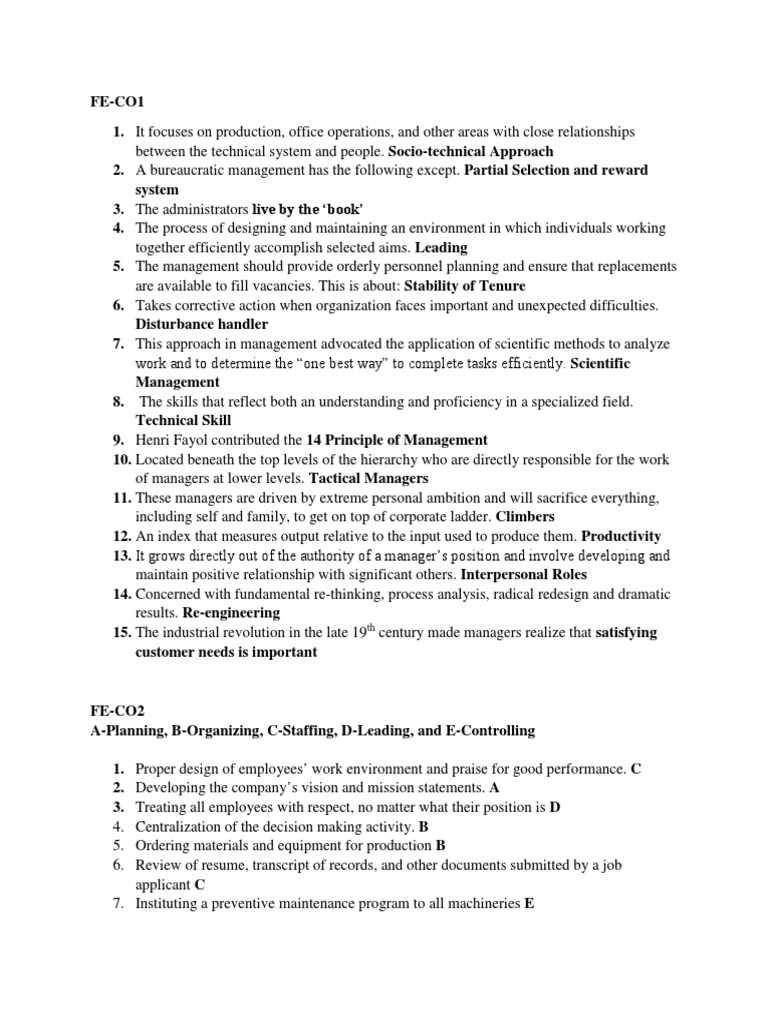 A-Planning, B-Organizing, C-Staffing, D-Leading, and E-Controlling